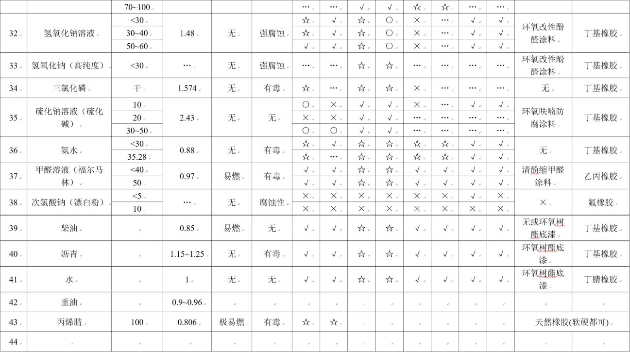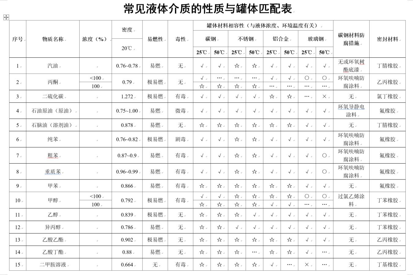 (1).罐體材料相容性符號含義:☆優(yōu)良;√良好;○可用但腐蝕較重;×不適用;…未知 (與溶體濃度、環(huán)境溫度有關);